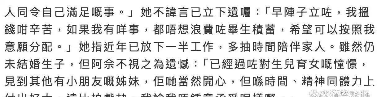 “挣取财富实属不易十大股票配资网址,若不幸有事发生,请勿动用我毕生积累。”佘诗曼在镜头前淡然地吐露此言,手中紧握的是一份价值高达2亿港元的遗嘱。虽已年届五十、单身且膝下无子,但她早已对身后之事做了周密规划。在这份遗嘱中,母亲位列首位受益人,其次是兄弟姐妹。她的资产清单宛如一部记录港圈“楼后”奋斗历程的史诗,其中包含5至7套位于香港核心地段的房产、众多基金、豪华汽车以及生意,每一项成就都凝聚了她的辛勤汗水。