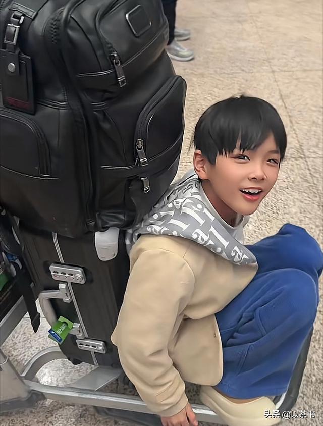 14岁哥哥杨安迪一身黑色,侧脸还是脸颊很肉乎,孩子大了可以自己推着行李,弟弟则坐着行李箱滑行,兄弟俩画风完全不一样,一个活泼阳光,一个沉稳有点成熟。