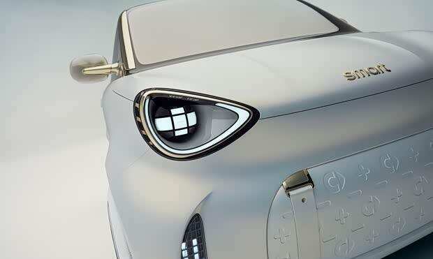smart精灵#2概念车基于品牌全新自主研发的纯电紧凑型专属架构打造,展现了经典双座车型的未来革新方向。该概念车外观轮廓延续了以往fortwo车型的风格,但在设计层面进行了全面升级。车头采用封闭式造型,三角形大灯组内嵌半包围LED光源,前包围中央设有类似旅行包造型的格栅结构,两侧则配备了像素风格LED显示屏。车身采用双色涂装与双门布局,轮圈为大尺寸半封闭式设计,整体造型小巧灵动,贴合消费者对smart品牌的传统印象。